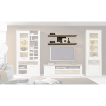 Landhaus im neuen Design. Dieses hochwertige Landhausprogramm überzeugt durch geschickt platzierte Applikationen in Eiche Antik Nachbildung. Durch die weißen Korpen verleiht dieses Programm Ihrem Wohnzimmer ein stimmungsvolles Ambiente. Die Griffe dieses Programms sind aus Nickel matt. Die passende Beleuchtung erhalten Sie in unseren Märkten. Das Wandboard bietet Ihnen mit einer Breite von ca. 140 cm viel Platz für stimmungsvolle Dekoration. – In ausgewählten Filialen erhältlich!
